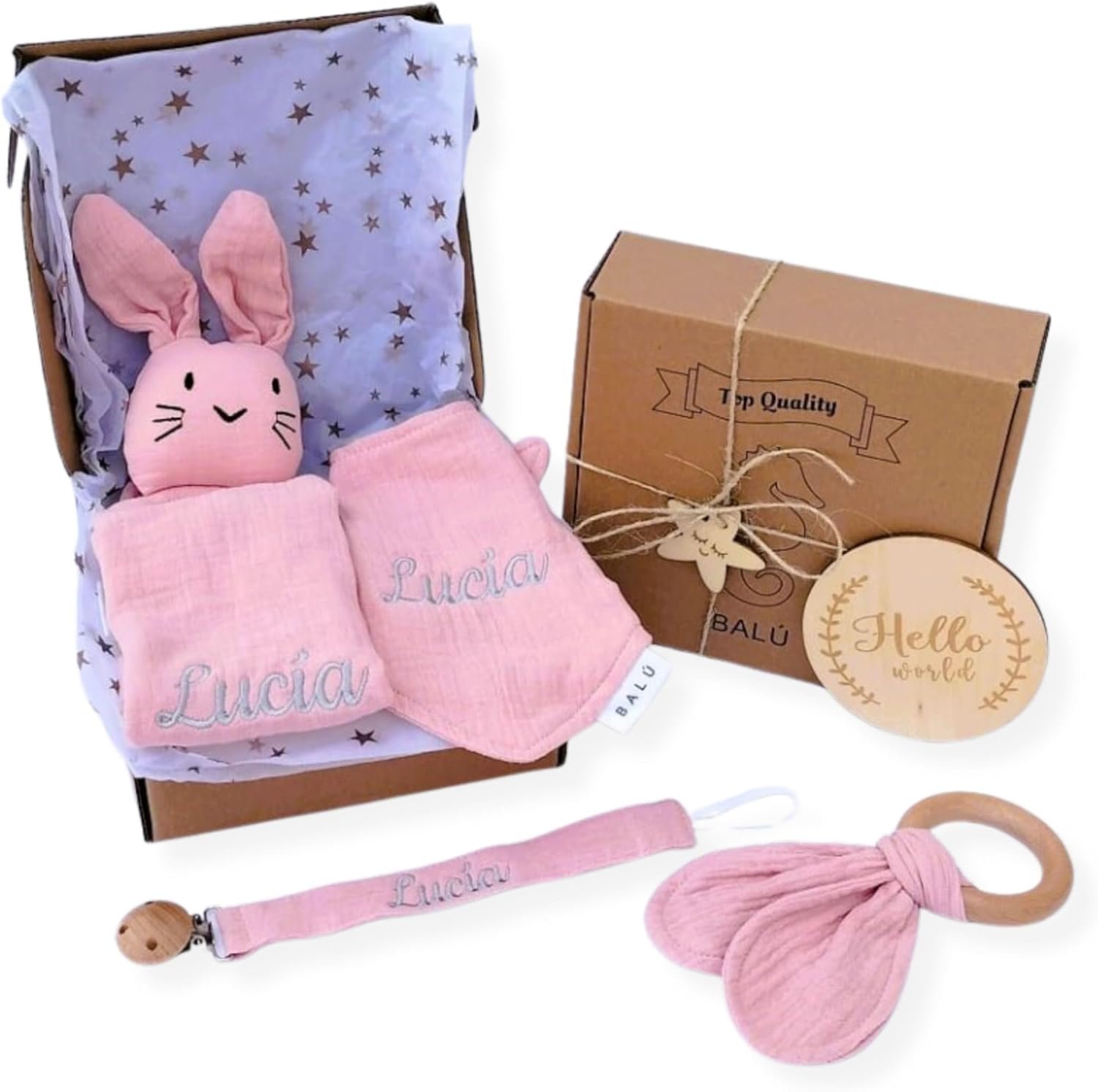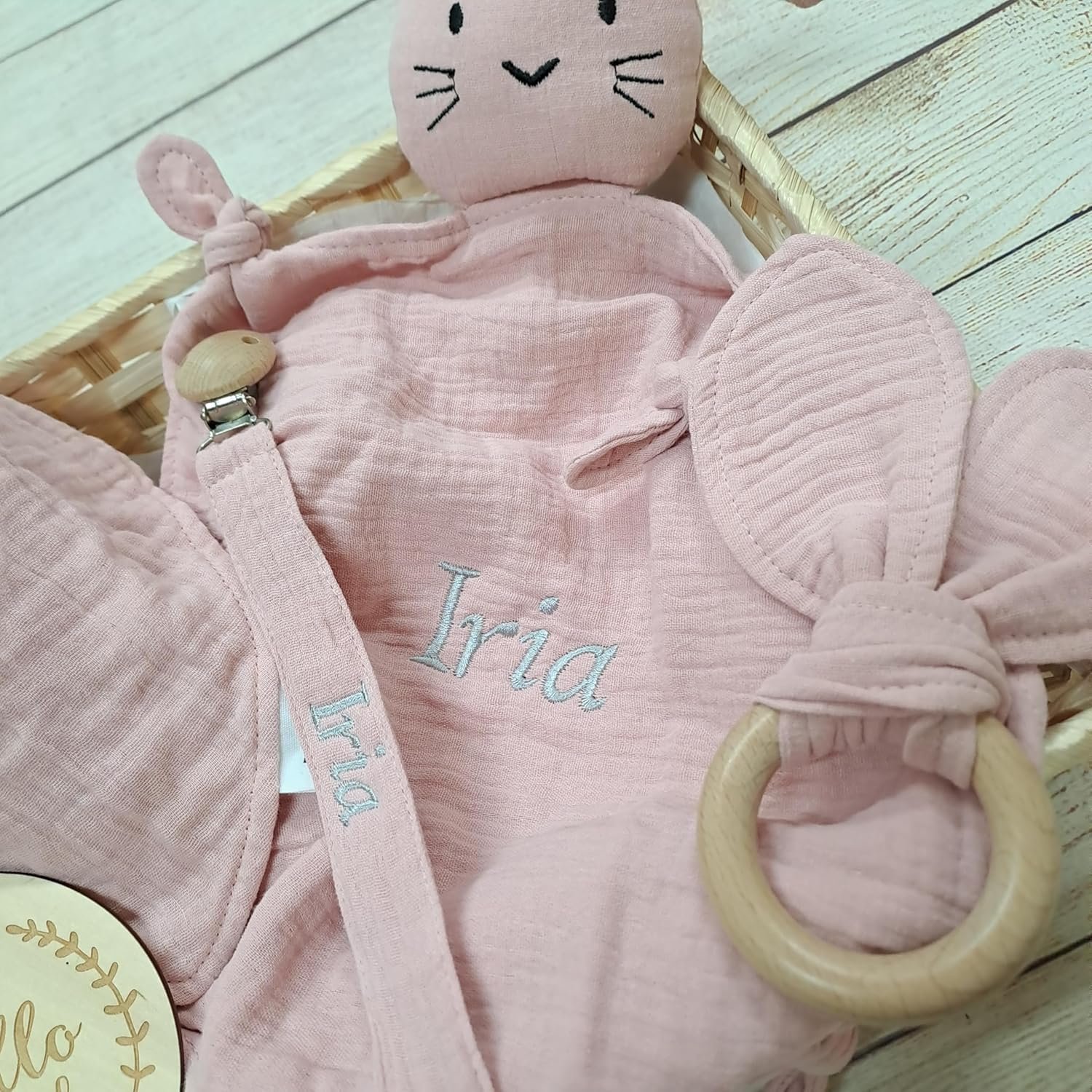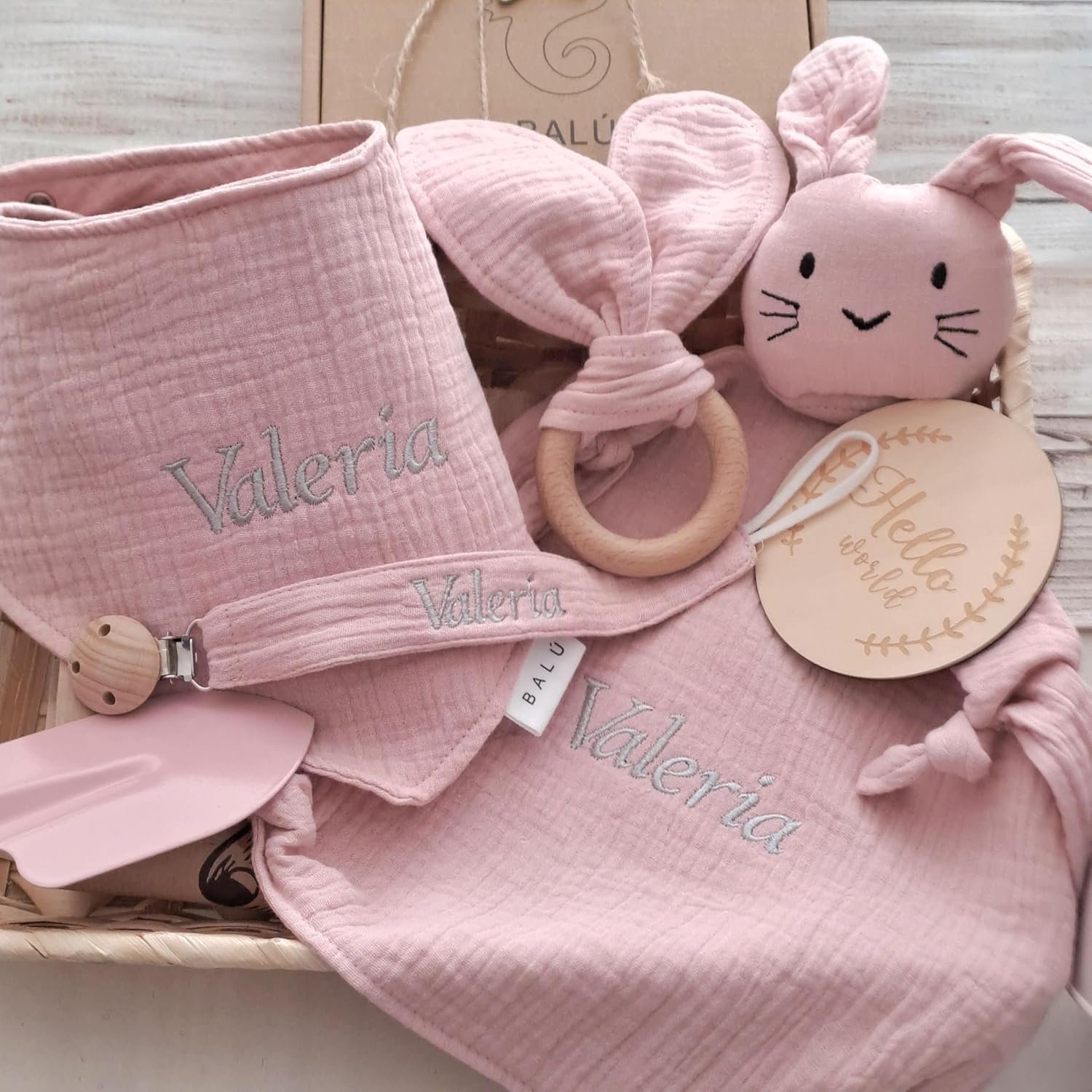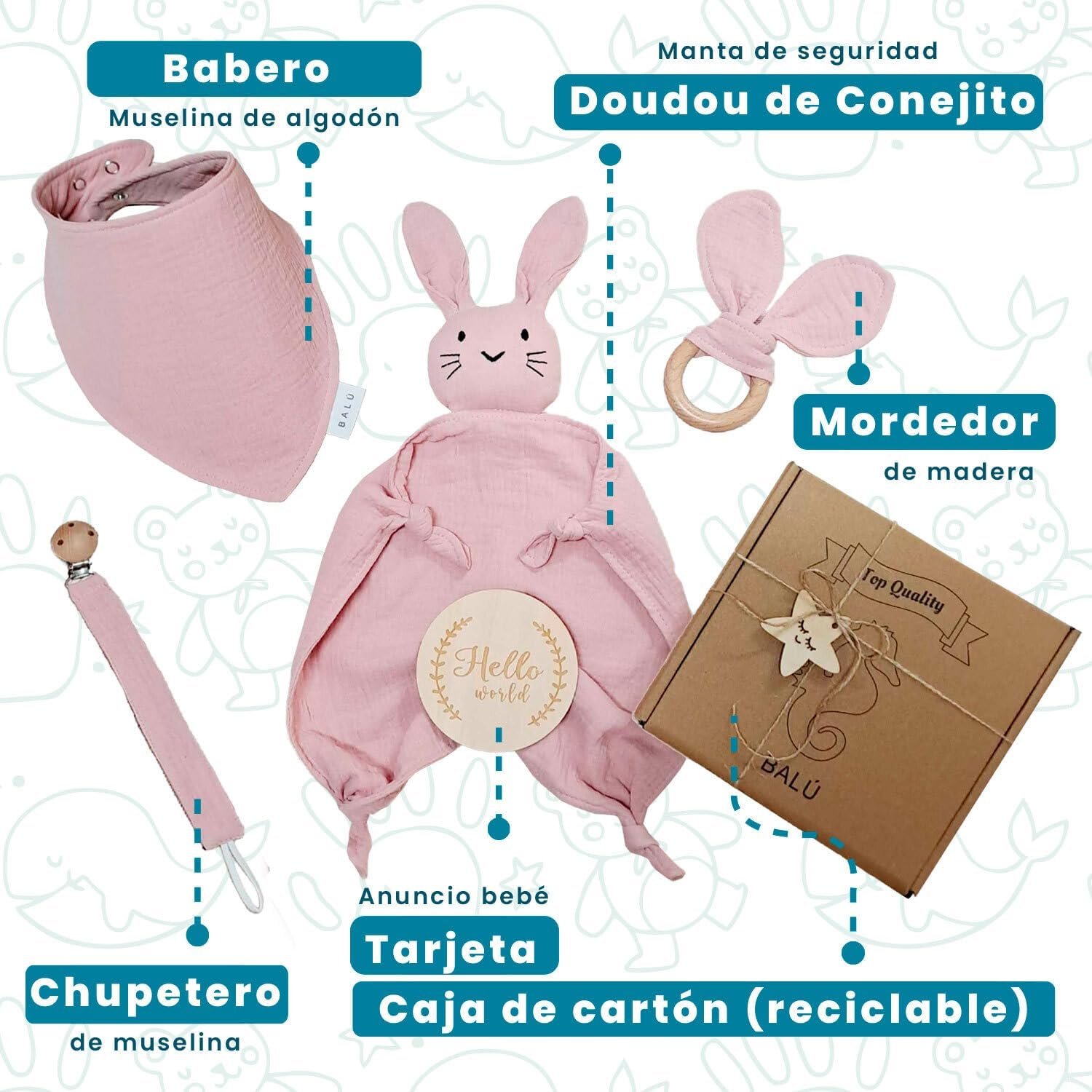 - 💕 TODO EN UN SOLO PACK – La cesta bebe rosa contiene 5 piezas seleccionadas con mimo: doudou con nombre, babero, mordedor, chupetero y tarjeta. Ideal como regalo recien nacido niña que destaca entre las cestas bebe por su calidad y presentación.